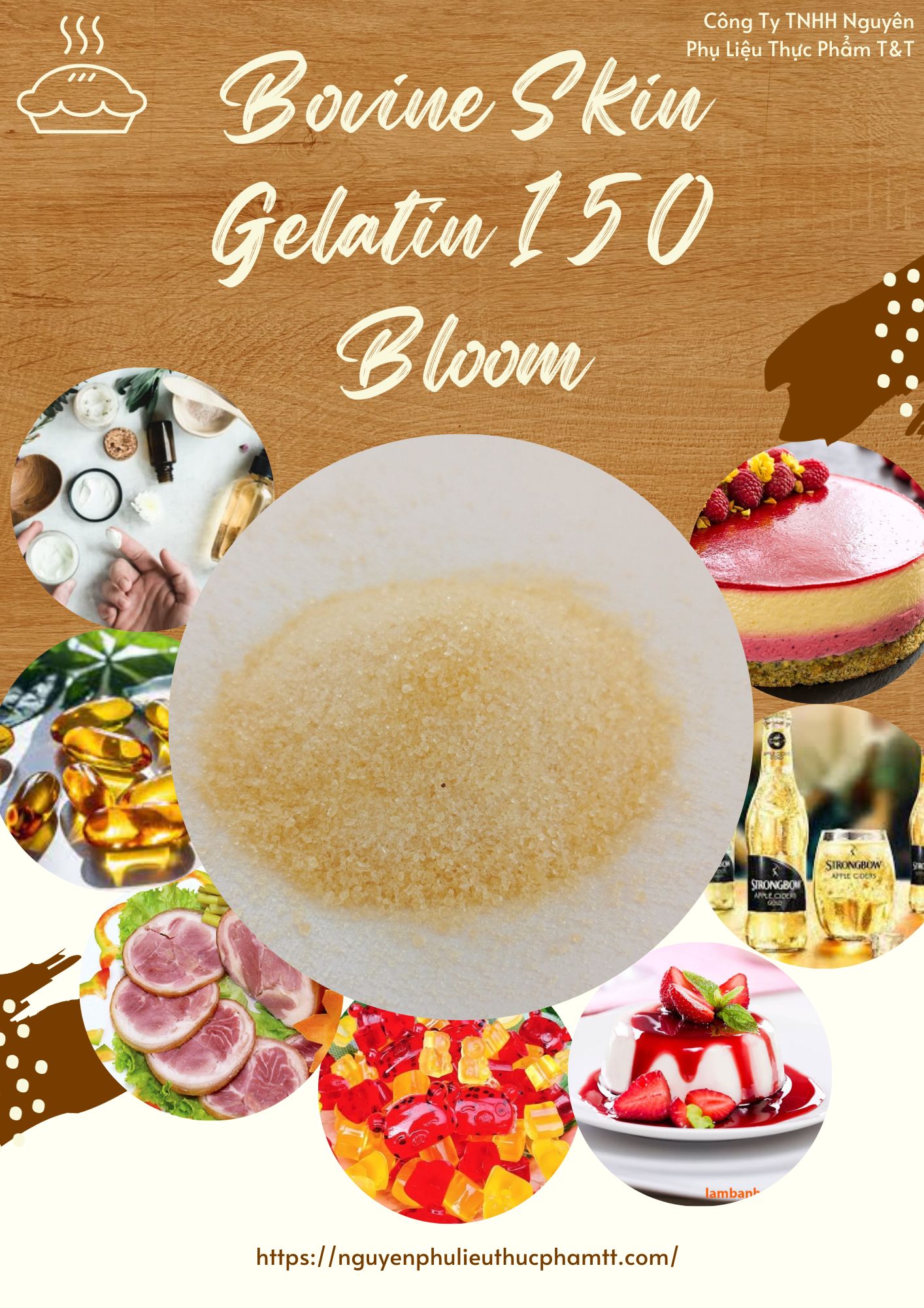 Gelatin là chất tạo gel kìm hãm quá trình kết tinh, Gelatin tan được trong nước nóng, và trong một số loại rượu như: glycerol, propylene glycol, sorbitol, acid acetic và các dung môi hữu cơ. Gelatin 150 Bloom trương nở (đông đặc) khi cho vào nước lạnh, lượng nước hấp thu gấp 5- 10 lần thể tích chính nó.