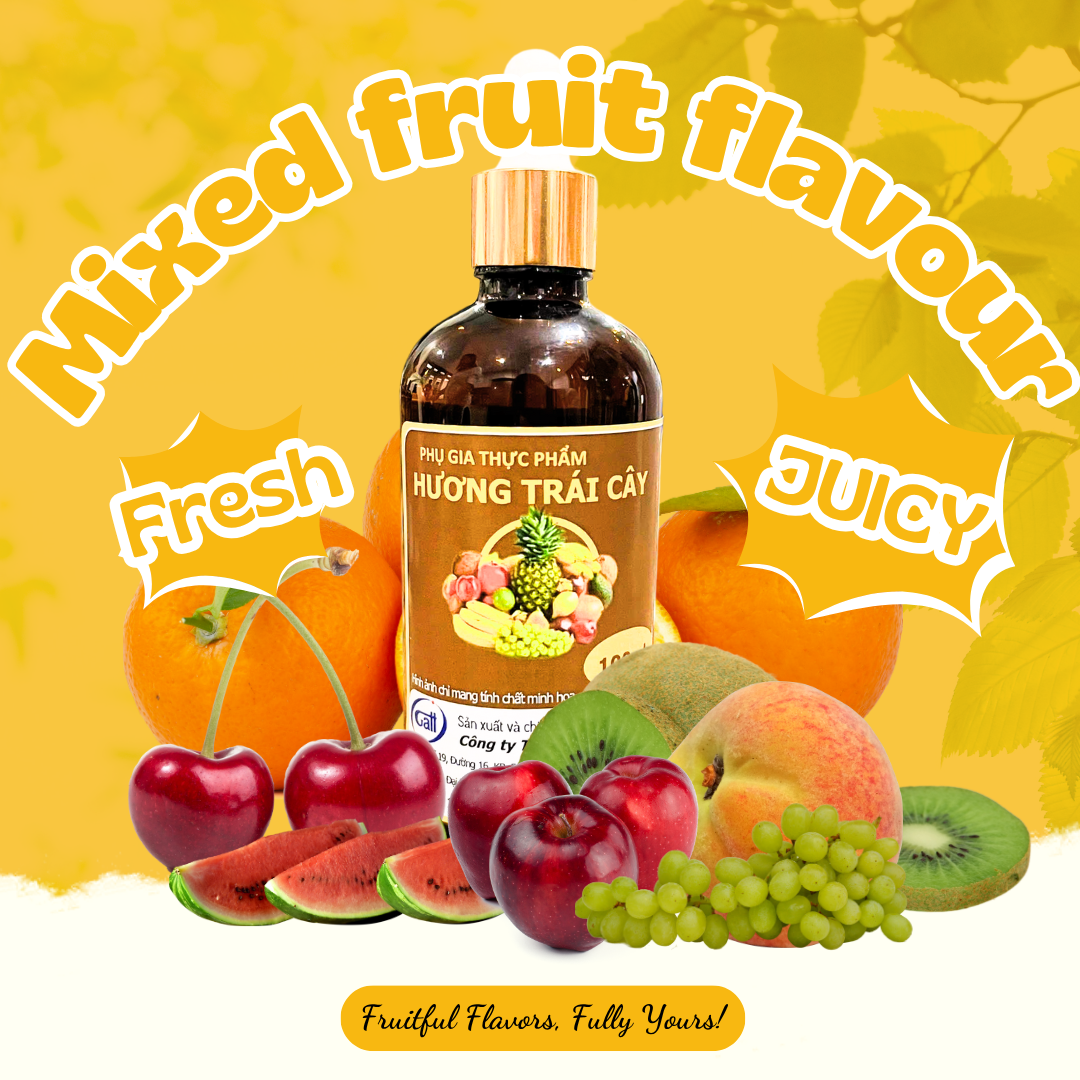Hương trái cây là hương liệu tự nhiên, an toàn cho sức khỏe, giúp tăng cường hương vị tươi mát, thơm ngon cho các món bánh, kẹo và nước giải khát. Với hương vị trái cây đặc trưng, sản phẩm này mang đến cho bạn những món ăn và thức uống hấp dẫn, đầy sức sống mà vẫn đảm bảo chất lượng và an toàn tuyệt đối khi sử dụng.
